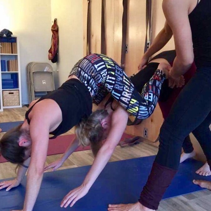 L’atelier débute par une pratique de yoga traditionnelle. Le corps se met doucement en mouvement, apprivoisant le joli accent franco-américain d’Heidi Blais, notre guide pour les 3 prochaines heures : une pro de l’acroyoga. S’en suivent une panoplie de mouvements avec des partenaires différents, dans une ambiance de Twister géant : épaule sur genou, hanche sur omoplate… Ah! Je comprends finalement : c’est qu’on s’acclimate tranquillement aux autres corps, mais aussi au ferme touché nécessaire. Cette portion était fort probablement arrangée avec le gars des vues; tous les participants ressentant assurément ce même inconfort.