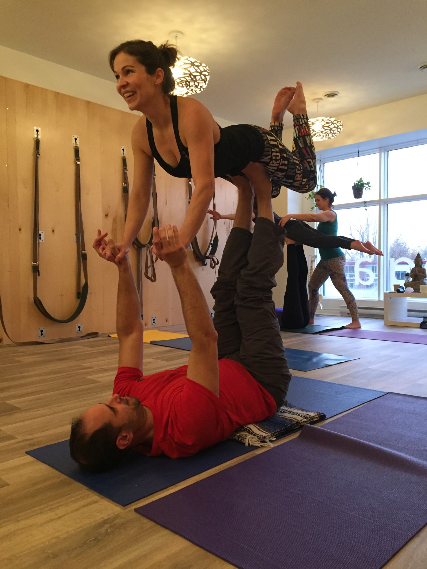 Fin finaude que je suis, je croyais avoir trouvé la solution idéale pour éviter cette délicate situation de proximité corporelle. J’avais convaincu mon chum de m’accompagner! Je me disais qu’il ferait une excellente base, pour la petite voltigeuse que je serais. C’était simple de même dans ma tête. Hummm… J’avais négligé l’aspect contrepoids avec lequel il faut bien logiquement travailler, en yoga acrobatique. Ce qui fait que la petite dame à la grande bulle d’intimité que je suis, a bien été obligée, un peu plus tard, d’accepter de se faufiler sur les hanches de sa nouvelle amie Marie-Claire, de s’immiscer entre ses épaules et parfois même de se mouler à ses pieds! Confiance, abandon et proximité.